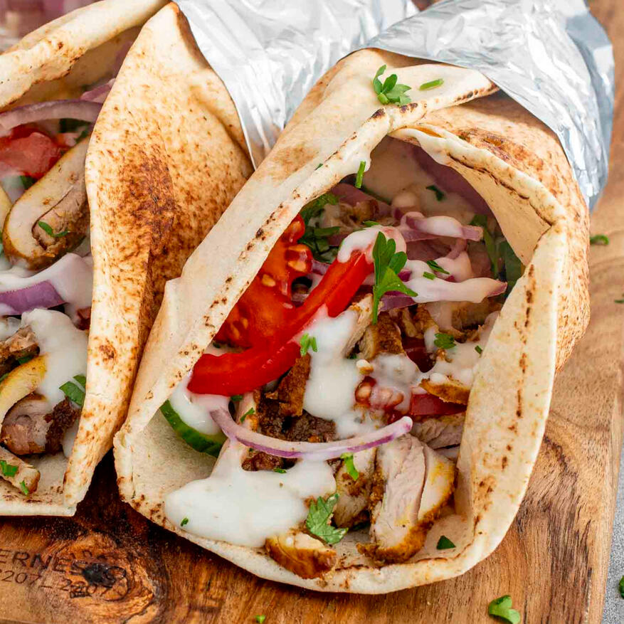 A flatbread wrap filled with tender meat or falafel, along with fresh tomatoes, garlic sauce and crisp pickled cucumbers.