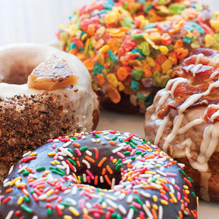 A classic treat, with a gourmet twist. Pick from traditional flavors like Chocolate Sprinkles and Glazed, all the way to fanciful inventions like Fruit Flake Cereal and Maple Bacon Crunch.